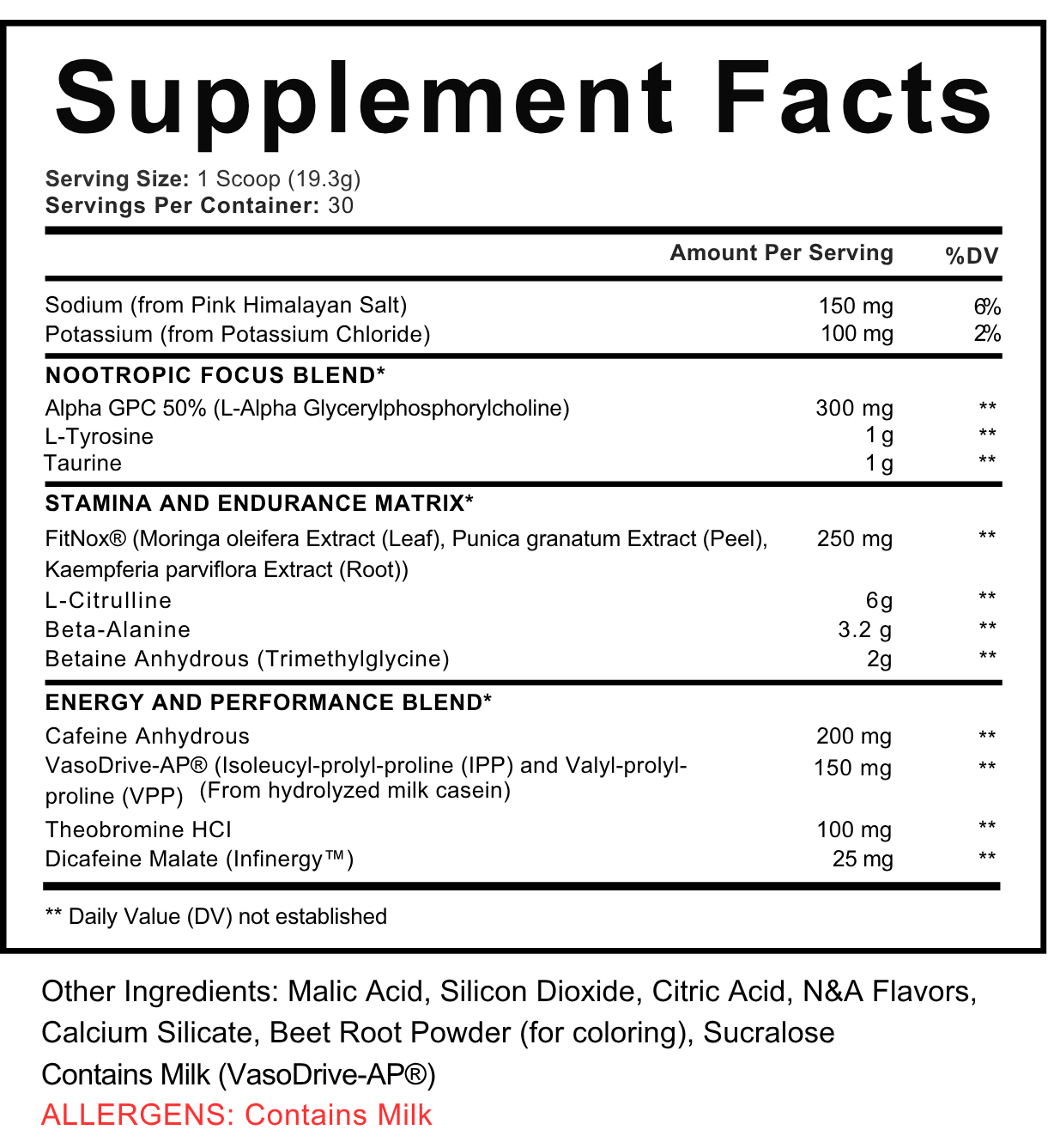 • 3.2g Beta-Alanine – Buffers lactic acid for extended endurance*