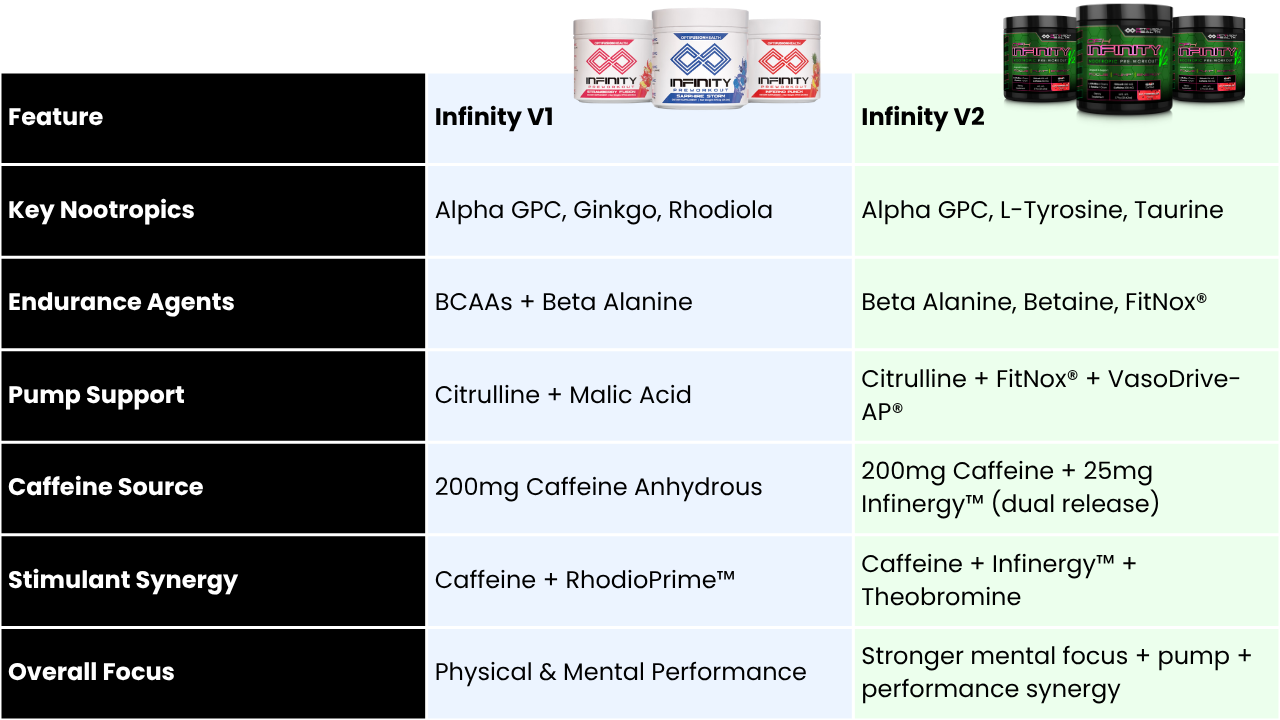 Infinity V2 combines the power of traditional pre-workout ingredients like Citrulline and Beta-Alanine with clinically studied nootropics like Alpha GPC, L-Tyrosine, and Infinergy™ for enhanced mental focus, smoother energy, and a better mind-muscle connection. It’s designed to fuel both your body and brain.